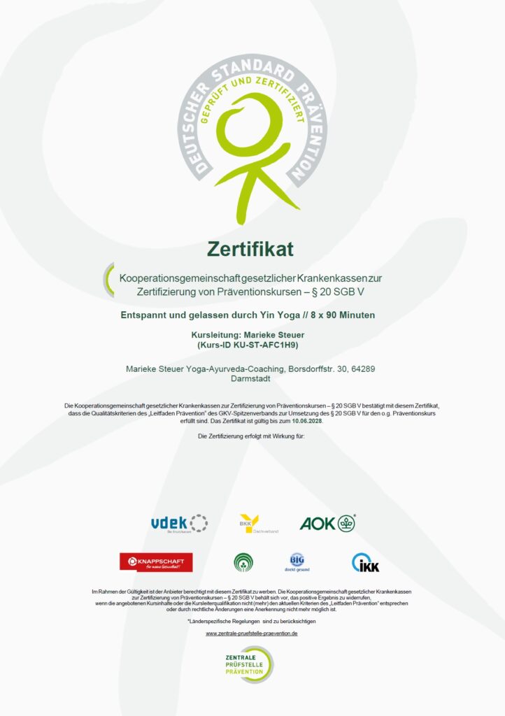 Meine Yogakurse sind von der ZPP (Zentrale Prüfstelle Prävention) zertifiziert und erfüllen damit höchste Qualitätsstandards.